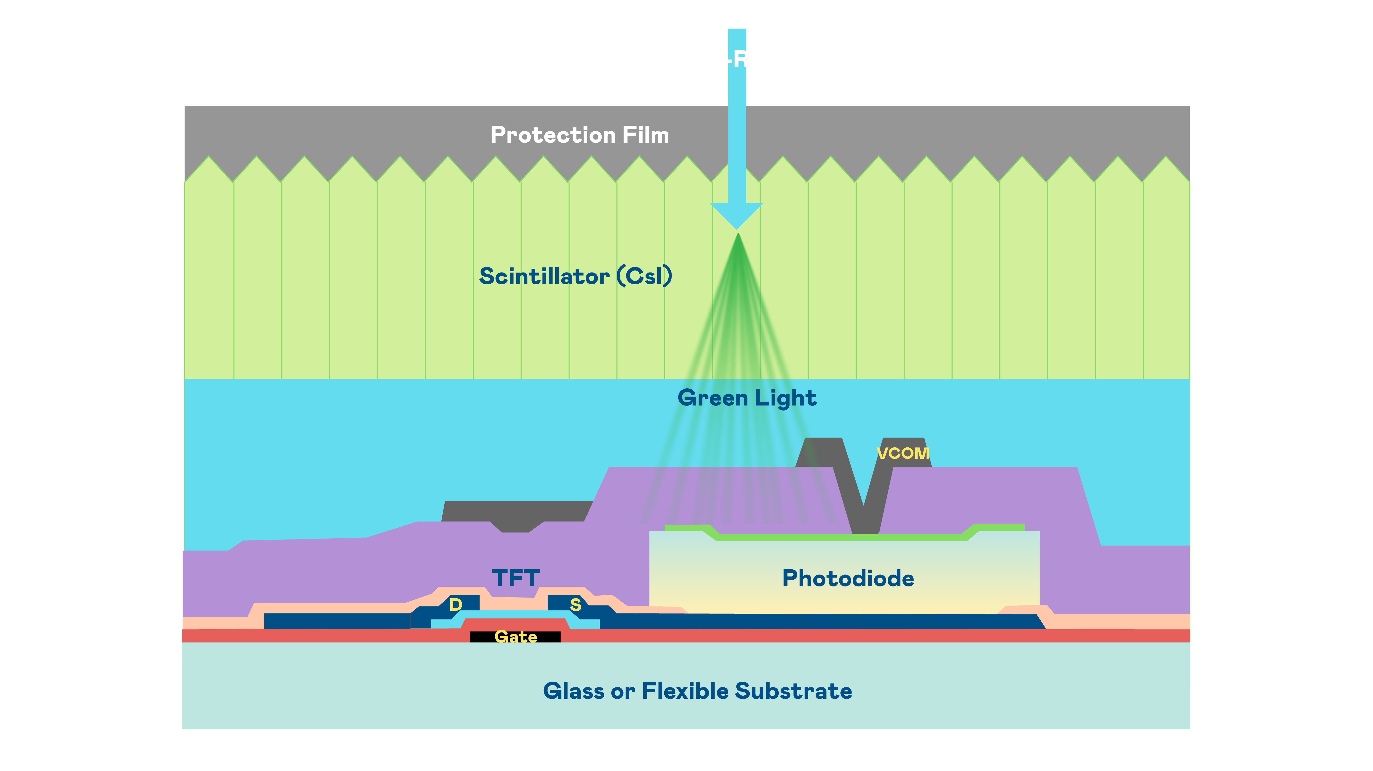 尊龙凯时的X光影像感測陣列使用薄膜電晶體 (TFT) 作為每個像素的讀取開關,搭配光電二極體(Photodiode)的光電轉換元件,用以感測X光影像訊號。